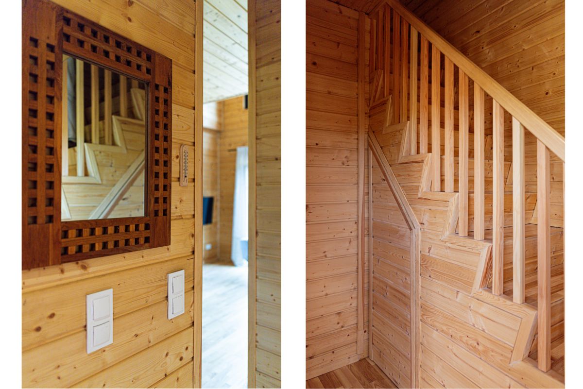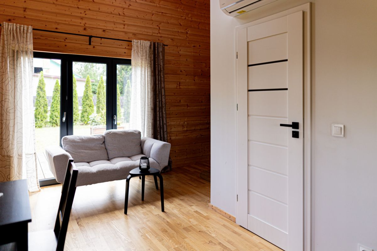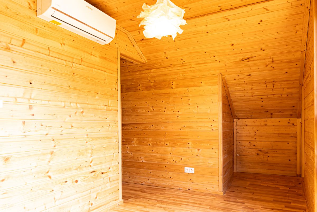 Dom jest całoroczny i został solidnie ocieplony wełną skalną, co zapewnia komfort cieplny przez cały rok. Ogrzewanie realizowane jest za pomocą kominka na pellet oraz klimatyzacji z funkcją grzania. Nieruchomość posiada instalację elektryczną, wodociąg miejski oraz kanalizację. Wnętrza wykończone są drewnem, a łazienka została wykonana z wodoodpornej płyty g-k wyłożonej gresem. Działka wyposażona jest w system automatycznego nawadniania, bramę wjazdową oraz furtkę.
