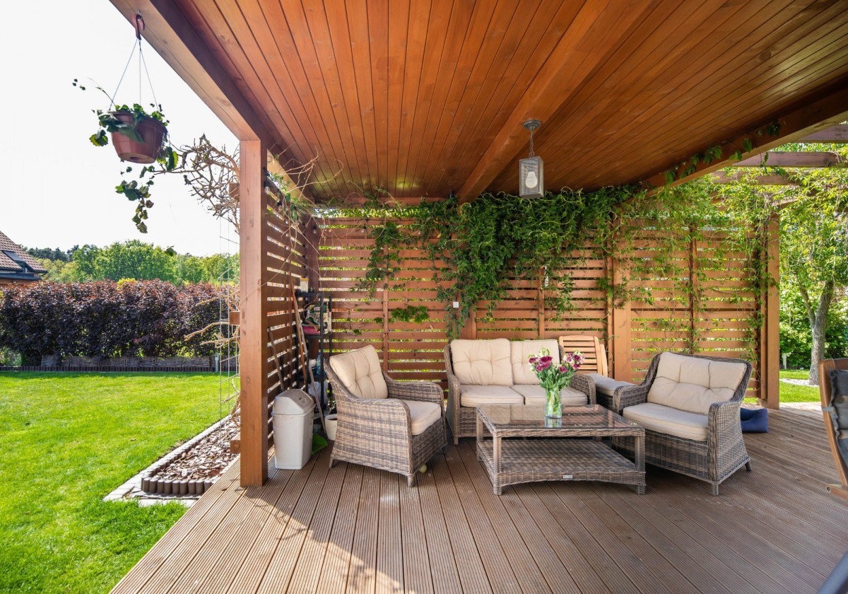 Salon zdecydowanie stanowi serce domu. Oprócz kominka i starannie dobranej aranżacji wnętrza uwagę przyciąga piękny widok na ogród oraz otaczającą zieleń. Z salonu prowadzi wyjście na taras, który w sezonie letnim staje się naturalnym przedłużeniem strefy dziennej. Znajduje się tam urokliwa pergola porośnięta pnączami, zapewniająca przyjemny cień w upalne dni i tworząca idealne miejsce do relaksu oraz spotkań z rodziną i przyjaciółmi.