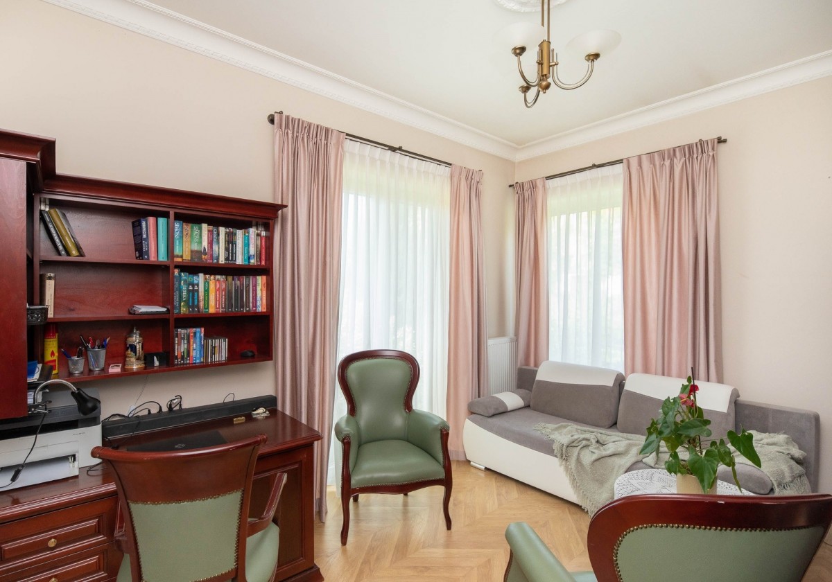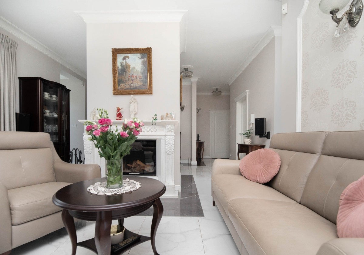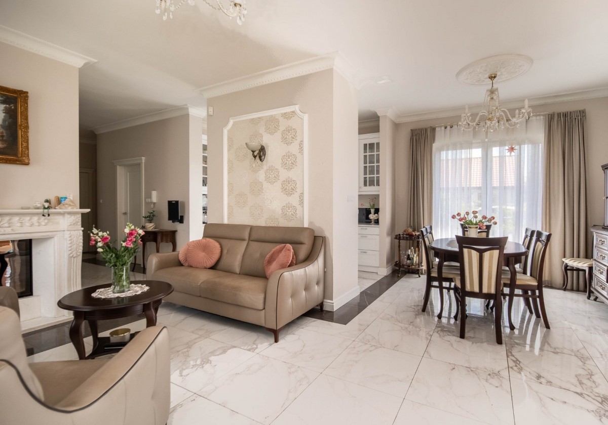 Drewniany parkiet nadaje wnętrzu ciepły i przytulny charakter, a duże okna wspaniale doświetlają całą przestrzeń. Wieczorami można spędzać czas przy eleganckim marmurowym kominku, z książką w ręku, ciesząc się spokojną i domową atmosferą.