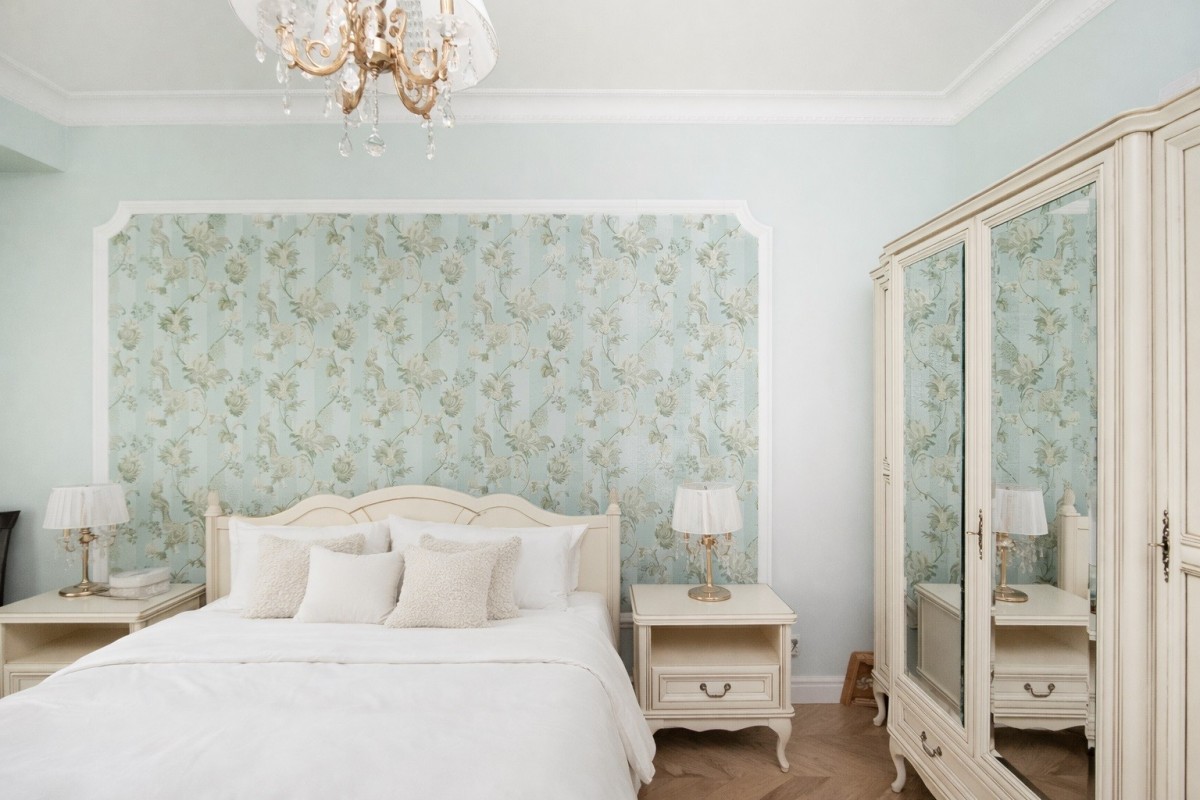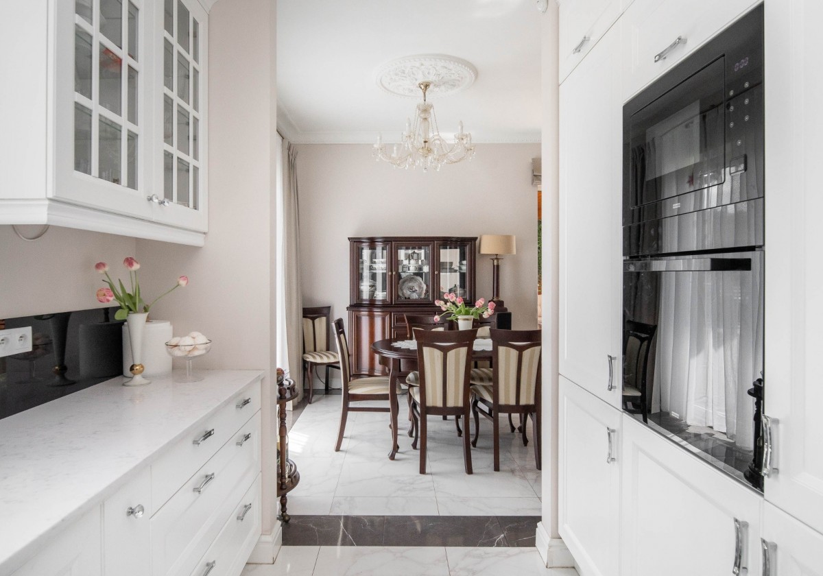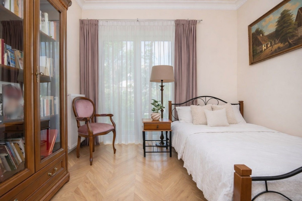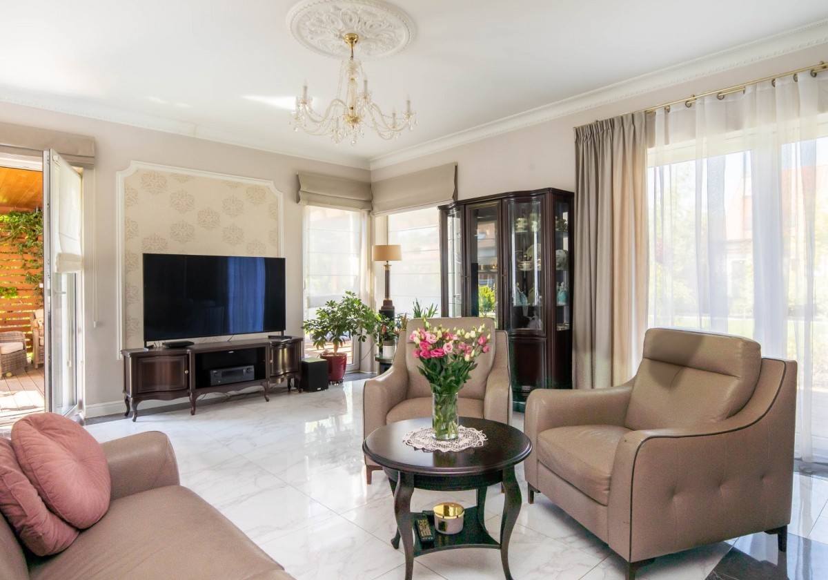 Drewniany parkiet nadaje wnętrzu ciepły i przytulny charakter, a duże okna wspaniale doświetlają całą przestrzeń. Wieczorami można spędzać czas przy eleganckim marmurowym kominku, z książką w ręku, ciesząc się spokojną i domową atmosferą.