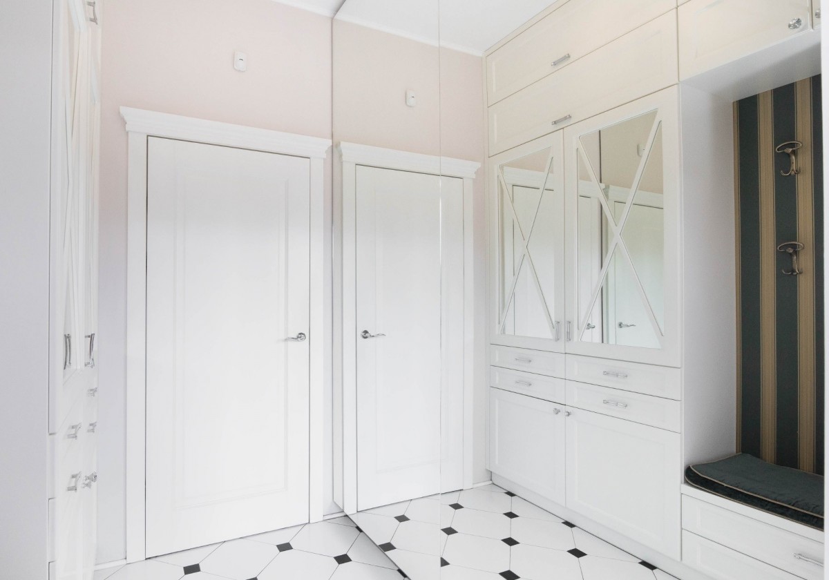 wiatrołap (4,69m2) z zabudową oraz miejscem do swobodnego ubioru obuwia, z ogromnymi lustrami optycznie powiększające przestrzeń