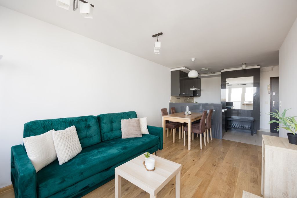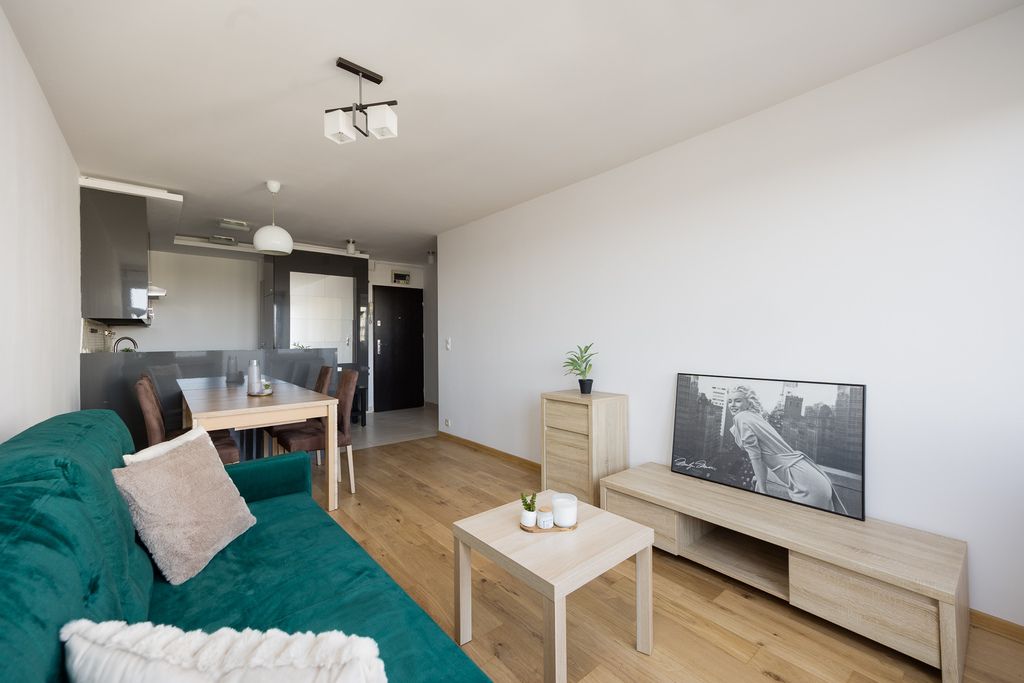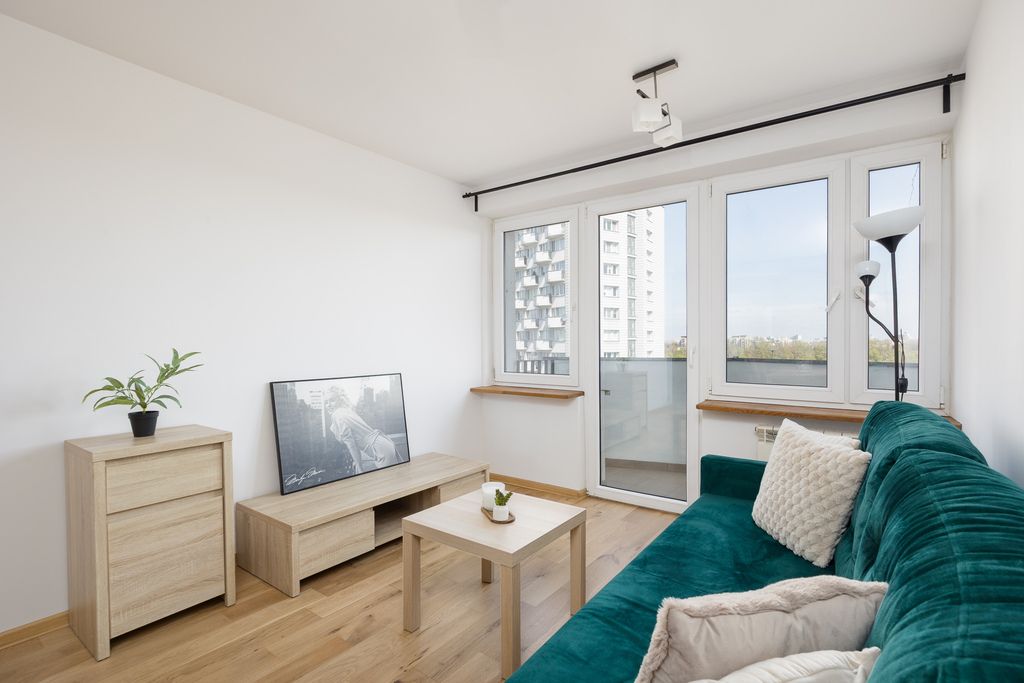 Gotowe do zamieszkania, dwupokojowe mieszkanie z balkonem i widokiem na Wisłę, położone na dziewiątym piętrze szesnastopiętrowego budynku z windą z 1968 roku, zlokalizowane na warszawskim Powiślu przy ul. Fabrycznej 2.