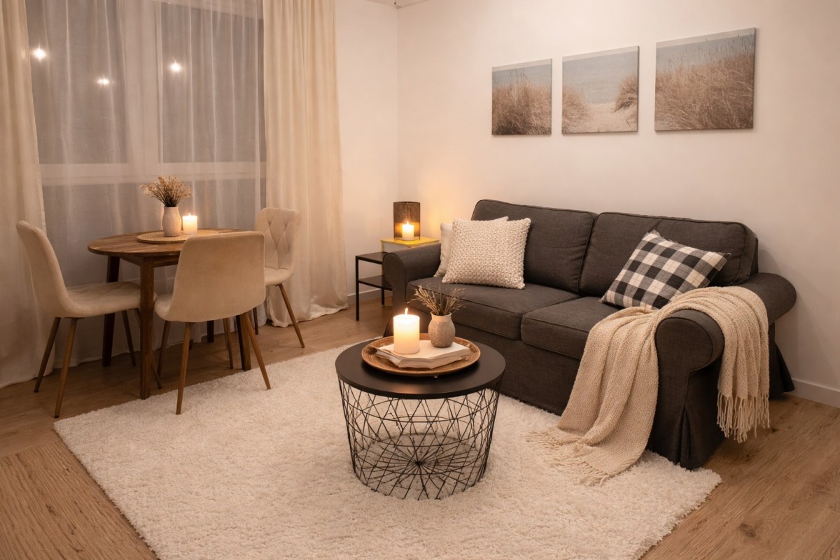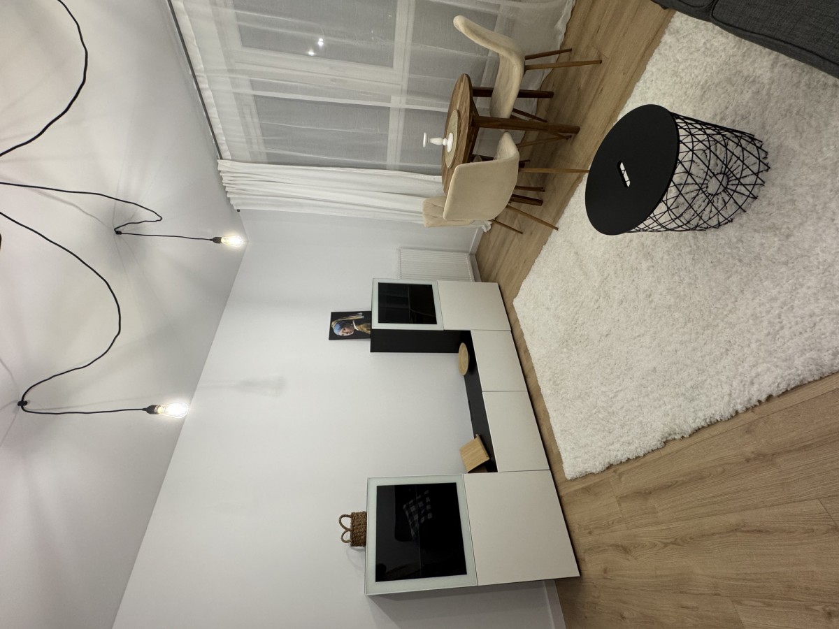 Kuchnia wyposażona w zmywarkę, lodówkę, piekarnik i płytę indukcyjną (Amica, Electrolux). Kuchnia połączona jest z salonem, w którym znajduje się stół z krzesłami, wygodna rozkładana 3-osobowa kanapa, stoliki kawowe oraz szafki. Salon posiada bardzo duże okna.