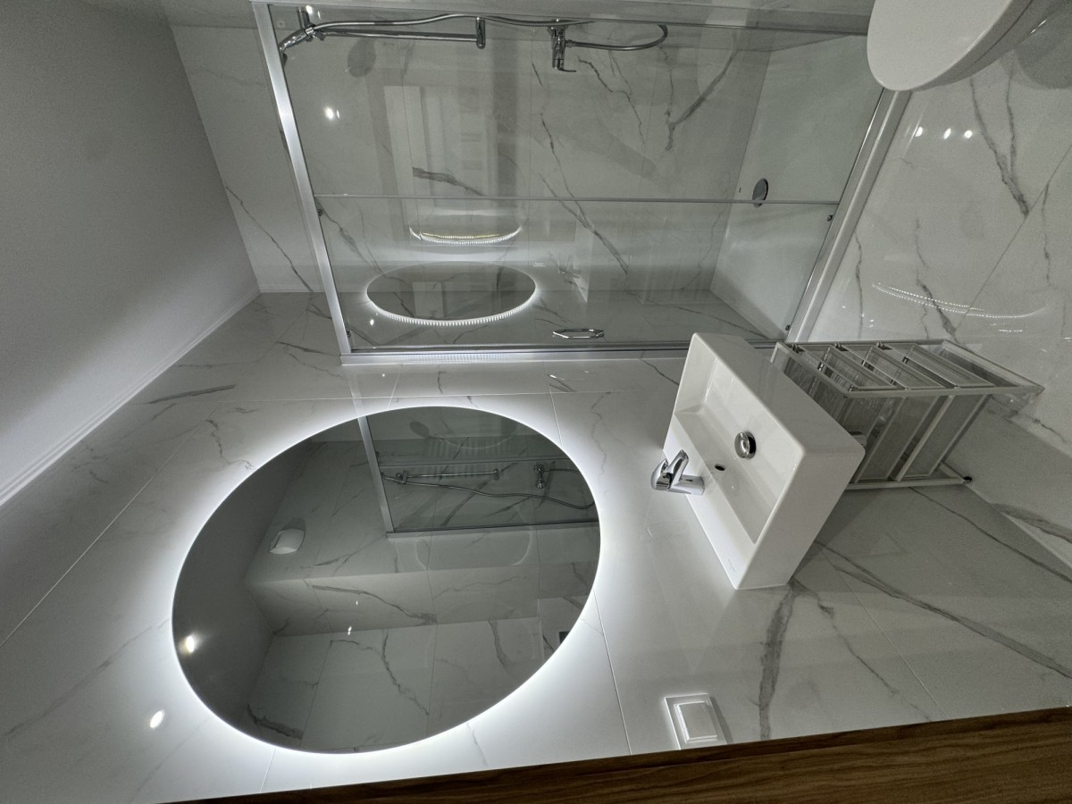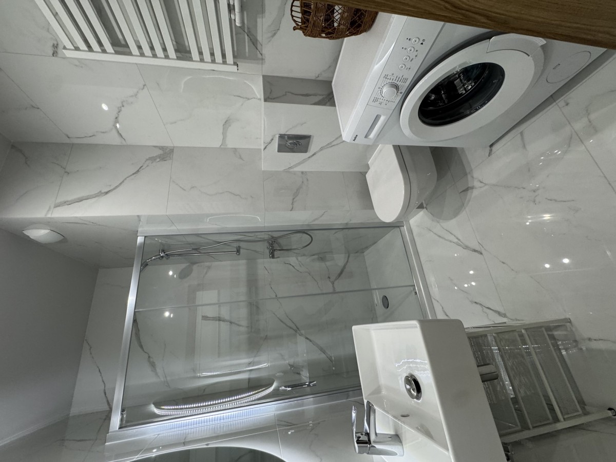 Łazienka wykończona gresem i ceramiką Villeroy&Boch, z prysznicem i umywalką Villeroy&Boch, dużym podświetlanym lustrem oraz pralką.