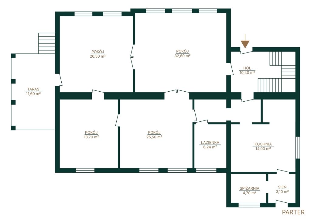 Parter tej wyjątkowej nieruchomości stanowi przestronny, widny salon z piecem kaflowym, 3 sypialnie, korytarz, hall oraz łazienka.