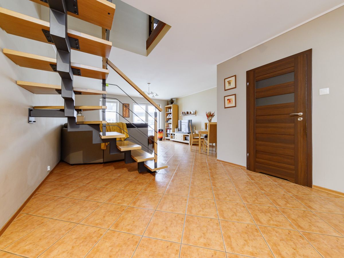 Duży, przestronny salon, ustawna kuchnia z jadalnią - dużo blatu, miejsca do przechowywania i przestrzeń na duży stół, pokój pełniący funkcję garderoby (możliwość wykorzystania jako gabinet), hol ze schodami prowadzącymi na drugi poziom.