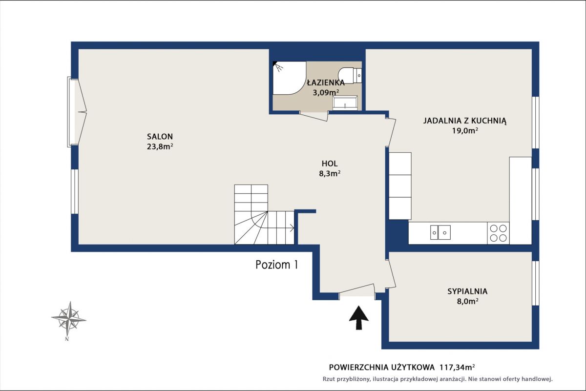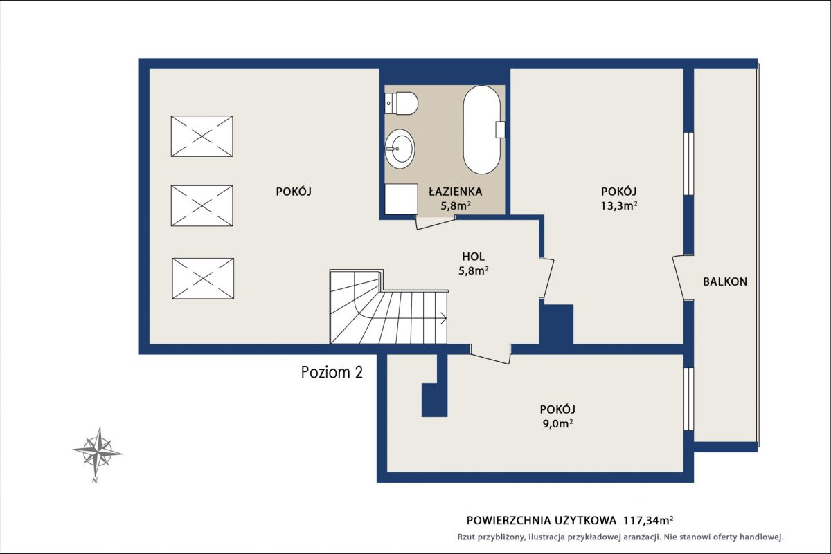 • Duża powierzchnia: 117,34 m² - idealna dla rodziny lub osób potrzebujących wielu funkcjonalnych pomieszczeń.