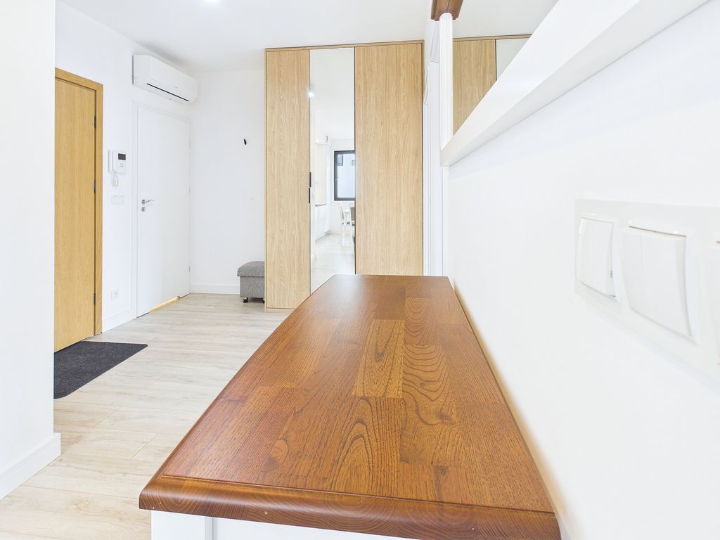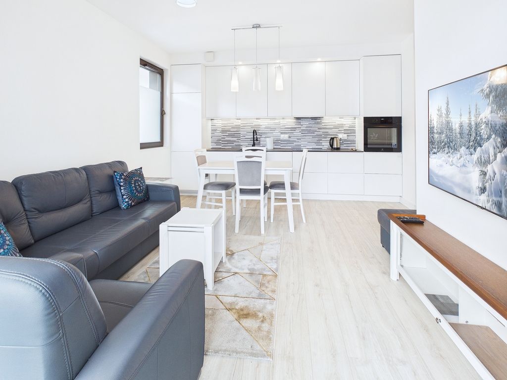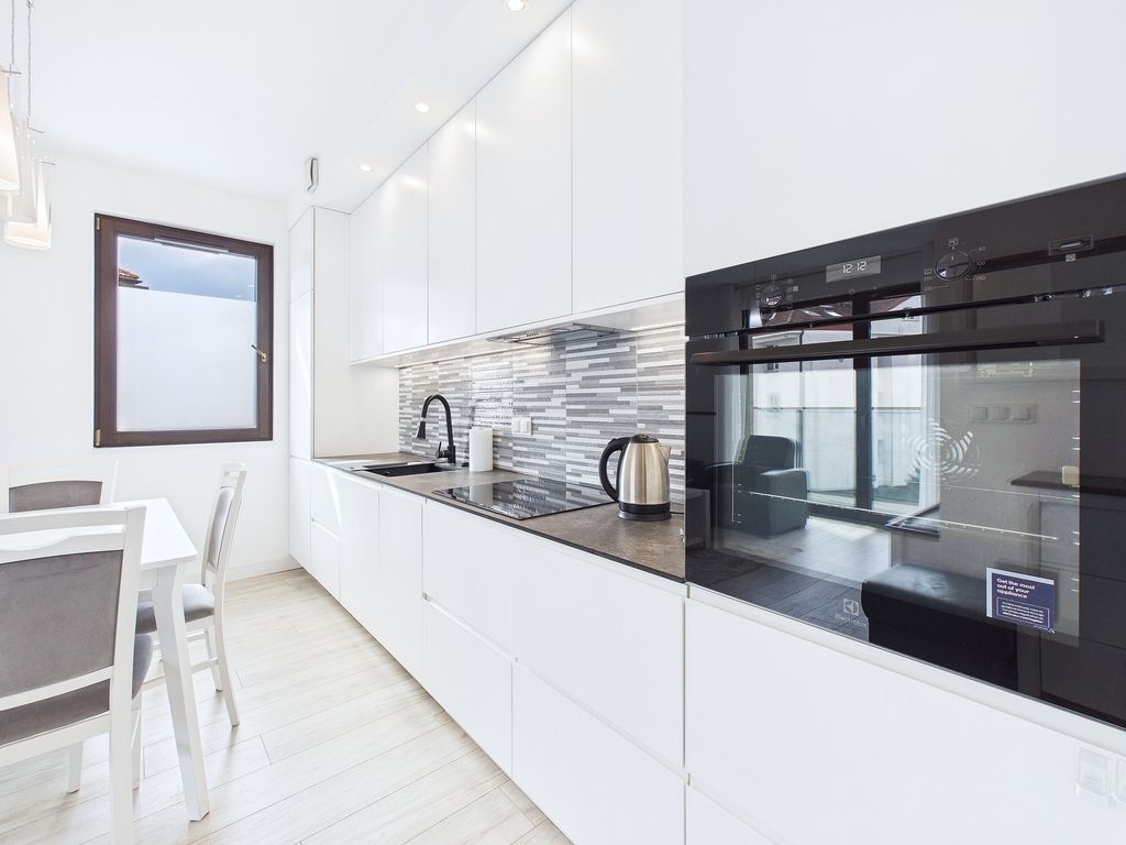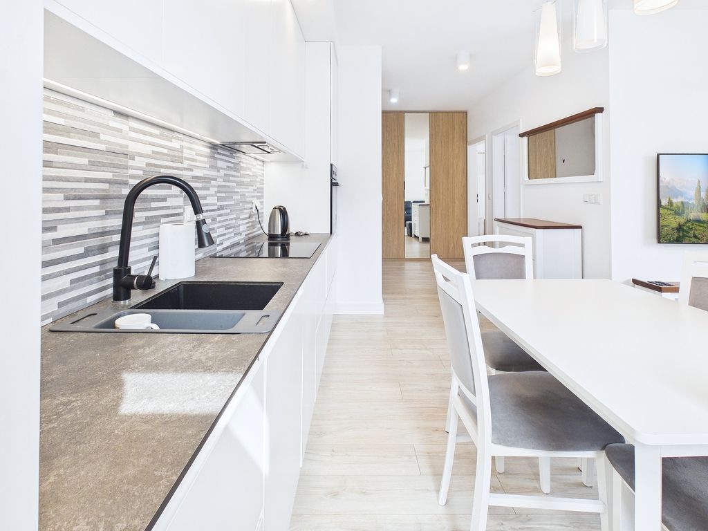 • Aneks kuchenny: z kompaktowym, nowoczesnym blatem, w pełni wyposażony w wysokiej jakości sprzęt AGD (lodówka, zmywarka).