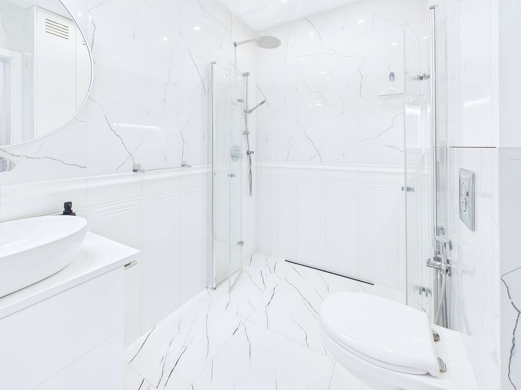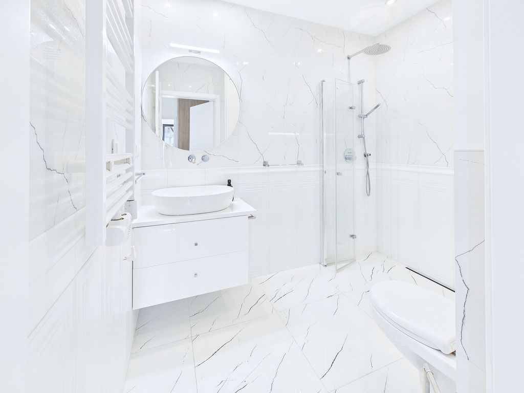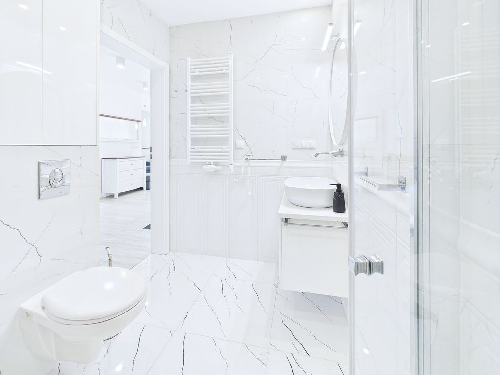 • Łazienka (4 m²): wykończona wysokiej klasy armaturą i płytkami, z dużym, nowoczesnym prysznicem oraz pralką.